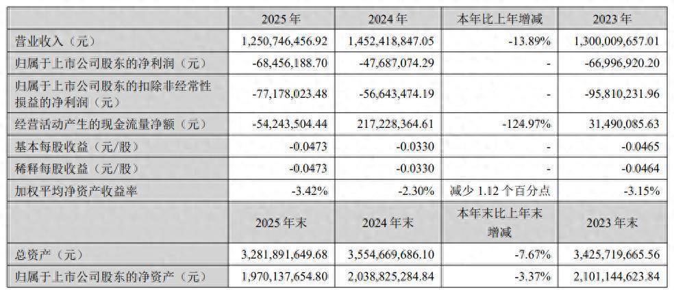 日前,智慧农业(000816)披露2025年年度报告。2025年,公司实现营业总收入12.51亿元,同比下降13.89%;归母净利润为-6845.62万元,上年同期亏损4768.71万元;扣非净利润亏损7717.8万元,上年同期亏损5664.35万元。